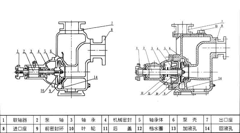 在一些泵的軸承體底部還設有冷卻室。當軸承發(fā)熱引起軸承體溫升超過70℃時,可在冷卻室處通過任意一只冷卻液管接頭,注人冷卻液循環(huán)冷卻。泵內部防止液體由高壓區(qū)向低壓區(qū)泄漏的密封機構是前后密封環(huán),前密封環(huán)裝在泵體上,后密封環(huán)裝在軸承體上,當泵經(jīng)長期運轉密封環(huán)磨損到一定程度,并影響到泵的效率和自吸性能時,應給予更換。 |