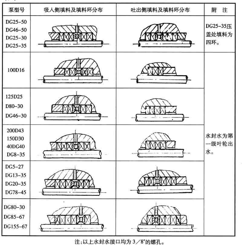 本型泵在使用時(shí),填料環(huán)的位置安放要正確,各型泵的填料及填料環(huán)的分布情況見表2,填料的松緊程度必須適當(dāng),以液體能一滴一滴滲出為宜。