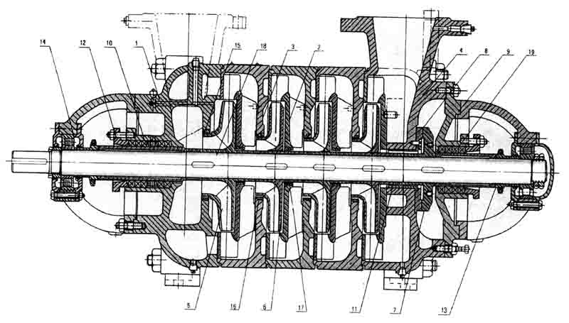 1、進(jìn)水段 2、導(dǎo)葉 3、中段4、出水段 5、首級葉輪 6、葉輪 7、平衡盤